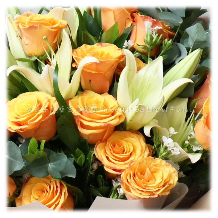 玫瑰花、百合、深山櫻、尤加利葉。