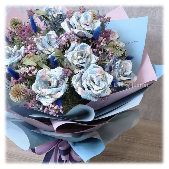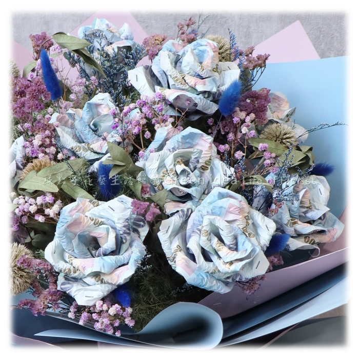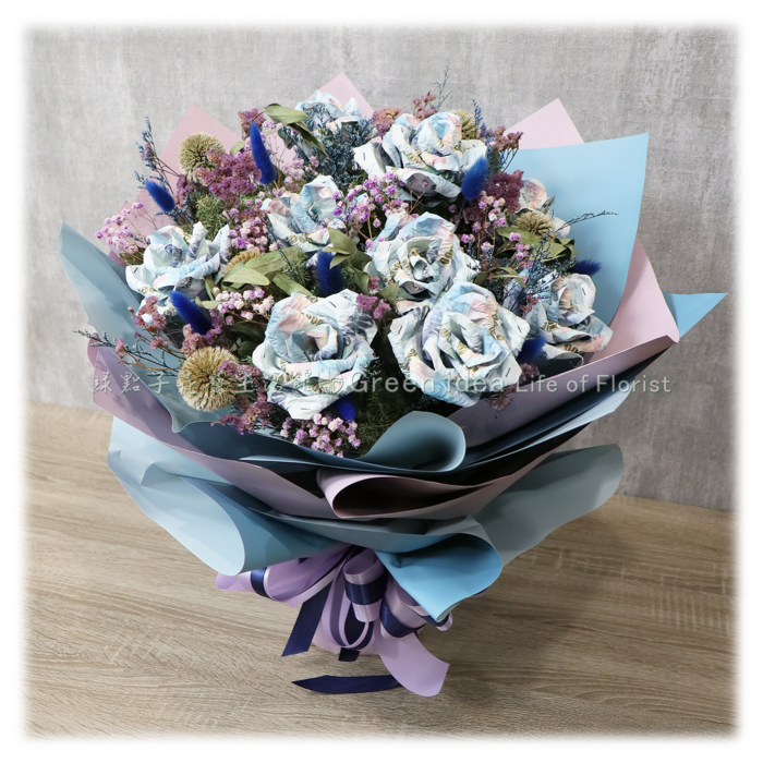 千元鈔45張、滿天星、乾燥花材。