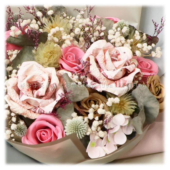 百元鈔10張、香皂花、滿天星、乾燥花材。